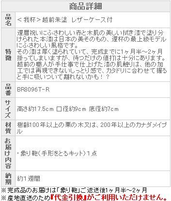 商品詳細 品名 <我杯>越前朱塗 レザーケース付 特徴 還暦祝いにふさわしい赤と木肌の美しい拭き漆で塗り分けられた本漆は日本の美そのもの、還杯の最上級モデルにふさわしい風格です。